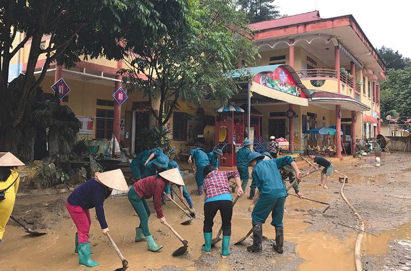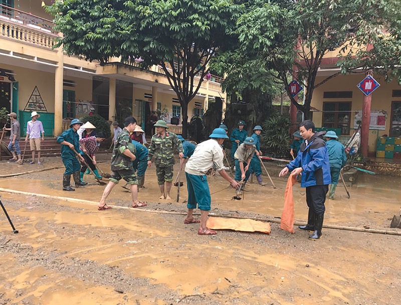 Giáo viên và bộ đội dọn dẹp trường sau lũ