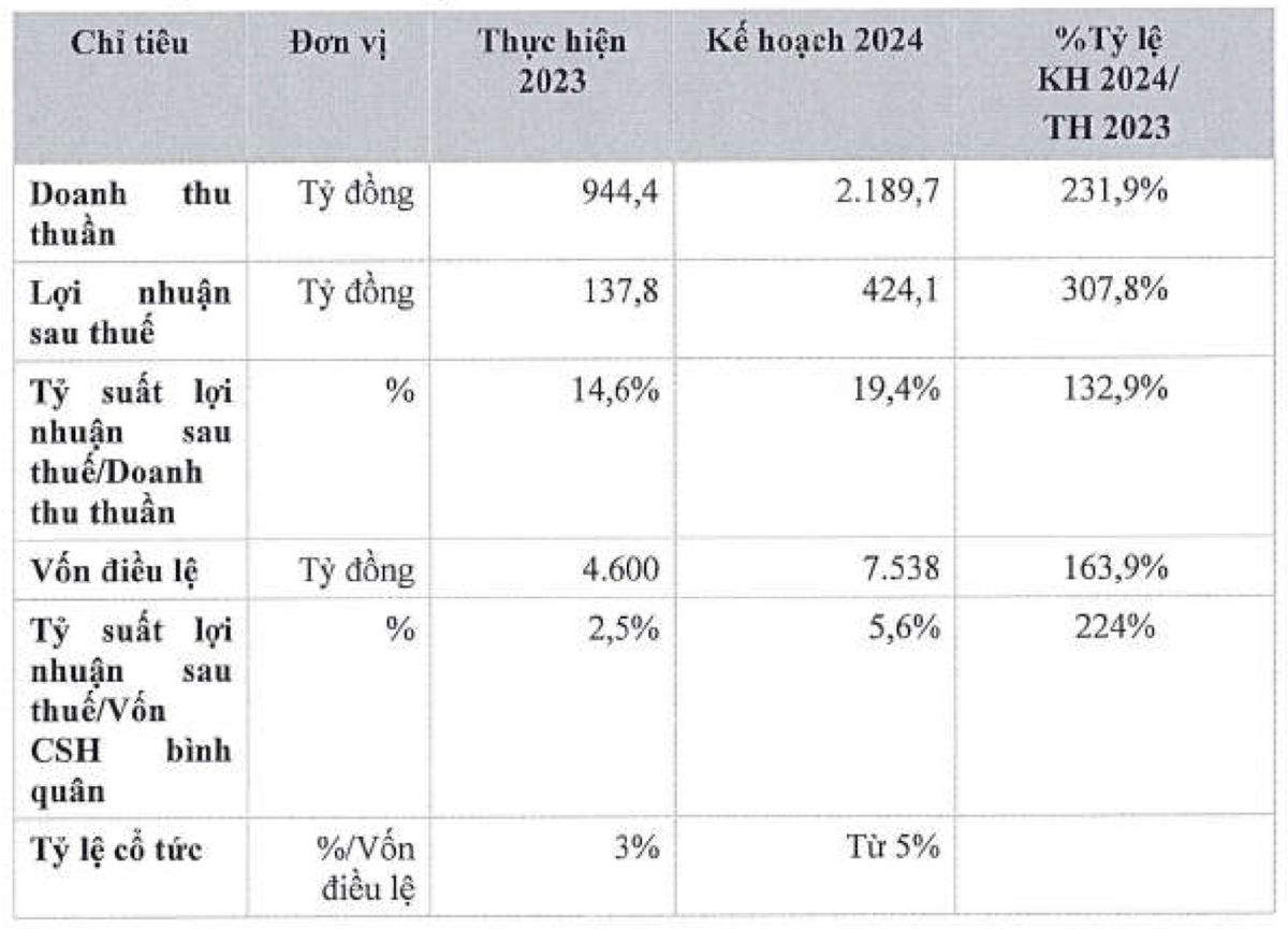 Theo đó, BCR đặt mục tiêu doanh thu năm 2024 đạt 2.190 tỷ đồng, gấp hơn 2 lần thực hiện 2023 và lợi nhuận sau thuế đạt hơn 424 tỷ đồng, gấp 3 lần năm trước.