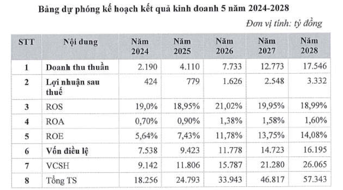 Với tỷ lệ tăng trưởng bình quân hàng năm là 69%, doanh thu giai đoạn 2024 - 2028 ước tính tăng từ 2.190 tỷ đồng lên hơn 17.546 tỷ đồng; lợi nhuận sau thuế dự kiến đạt hơn 3.300 tỷ đồng năm 2028, tương ứng tỷ lệ tăng bình quân năm là 67%.