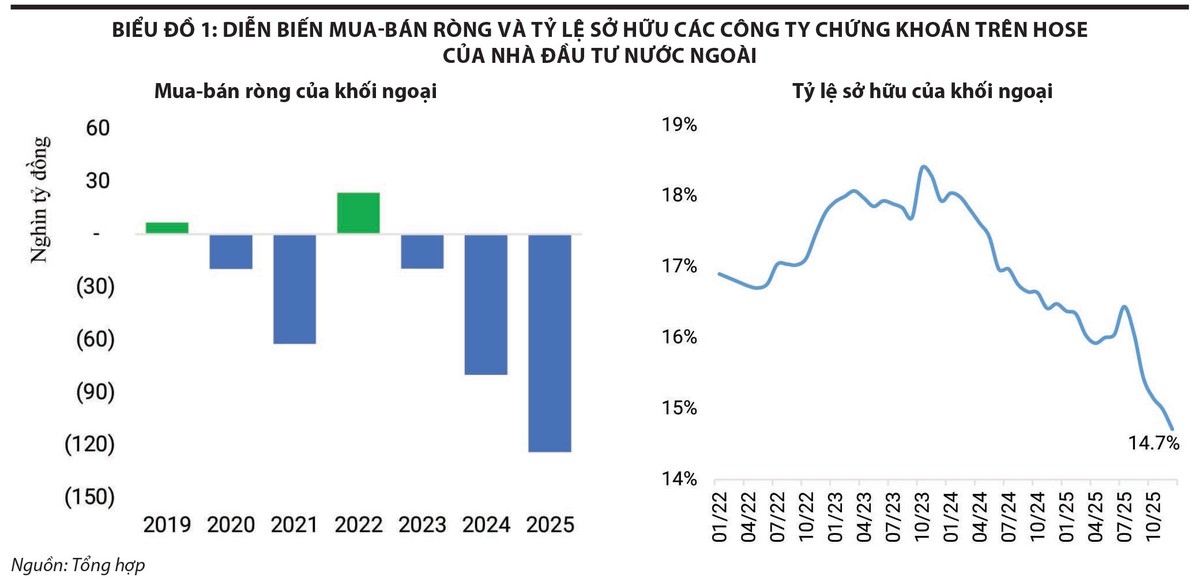 Việc tỷ lệ sở hữu liên tục hình thành các đáy mới cho thấy, vai trò của khối ngoại trong cấu trúc thị trường đang thu hẹp dần. Khi quy mô nắm giữ cổ phiếu của nhà đầu tư nước ngoài giảm xuống, mức độ tác động của hoạt động bán ròng lên xu hướng chung của thị trường cũng theo đó suy yếu. Trong bối cảnh này, thị trường vẫn có thể duy trì đà tăng ngay cả khi quy mô bán ròng của khối ngoại gia tăng, phản ánh thực tế rằng, động lực nâng đỡ thị trường ngày càng phụ thuộc nhiều hơn vào dòng vốn trong nước, cả trong việc hấp thụ lượng cổ phiếu bán ra lẫn trong vai trò dẫn dắt xu hướng điểm số.