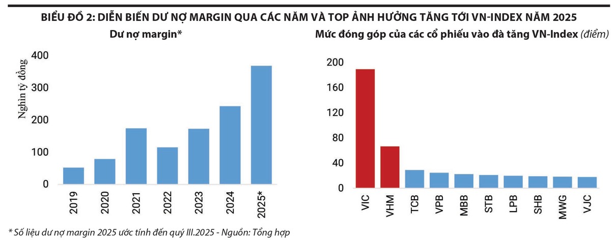 Dưới góc độ cấu trúc, sự gia tăng nhanh của dư nợ ký quỹ trong năm 2025 hàm ý rằng, vai trò dẫn dắt của dòng vốn nội địa không còn chỉ dựa trên nguồn vốn tự có, mà ngày càng phụ thuộc nhiều hơn vào tín dụng thị trường. Cơ chế này giúp khuếch đại sức mua của dòng vốn trong nước lên gấp 2-3 lần. Đáng chú ý, trong năm 2025, nhiều công ty chứng khoán đã chủ động giảm lãi suất cho vay giao dịch ký quỹ nhằm thu hút nhà đầu tư mới, qua đó làm giảm chi phí sử dụng đòn bẩy và gia tăng động lực tham gia thị trường.