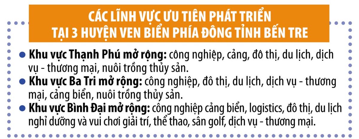Nghị quyết Đại hội Đảng bộ tỉnh Bến Tre nhiệm kỳ 2020-2025 đặt trọng tâm phát triển tỉnh về hướng Đông là nhiệm vụ then chốt, đột phá. Tỉnh cũng đã khai thác và phát huy những thế mạnh kinh tế biển của 3 huyện ven biển Bình Đại, Ba Tri, Thạnh Phú... Trong đó, hướng đến nuôi trồng, đánh bắt thủy hải sản, cảng cá, phát triển các khu công nghiệp, cụm công nghiệp ven biển, phát triển du lịch biển...