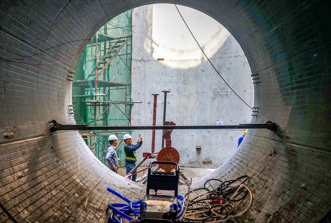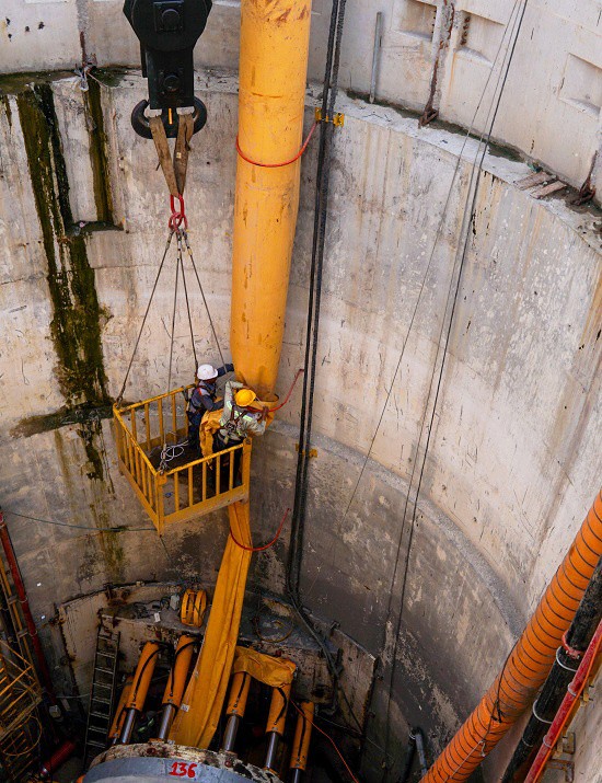 Dưới đáy giếng, những đốt cống được đẩy vào lòng đất bằng công nghệ khoan kích ngầm của Đức. "Công nghệ này có ưu điểm là việc thi công chiếm mặt bằng nhỏ, chỉ ở những vị trí làm hố sáp nên không ảnh hưởng tới giao thông, đời sống người dân", ông Tuấn cho biết.