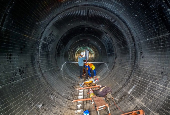 Trong đường cống, công nhân lắp đặt hệ thống ống thông để đẩy không khí từ bên ngoài vào đường cống.
