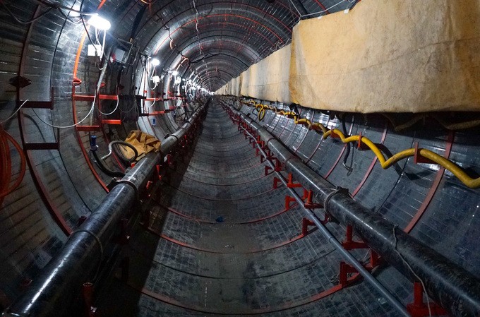 Một đoạn cống ở khu vực đường Mai Chí Thọ đã hoàn thiện, hệ thống ống dẫn khí, bùn, nước... được vận chuyển ra ngoài. Bên trong cống sơn nhựa PE chống thấm màu đen.