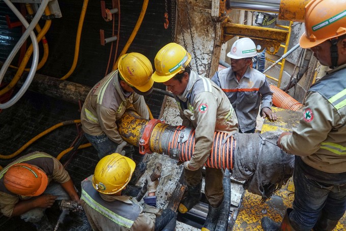 Trước khi khoan, nhóm công nhân lắp hệ thống ống để dẫn nước và bùn. Mỗi giếng có khoảng 40 công nhân thi công làm cống ngầm.