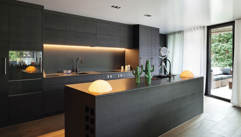 Ngược lại với gian bếp giản dị theo phong cách Bohemian là sự tinh tế về kiểu dáng của thiết bị bếp màu đen hiện đại. Sự tương phản rõ ràng giữa ánh sáng với các thiết bị kim loại, tủ bếp, bàn bếp tối màu tạo ra một không gian sang trọng, hiện đại và mang đến một cảm giác của tương lai.