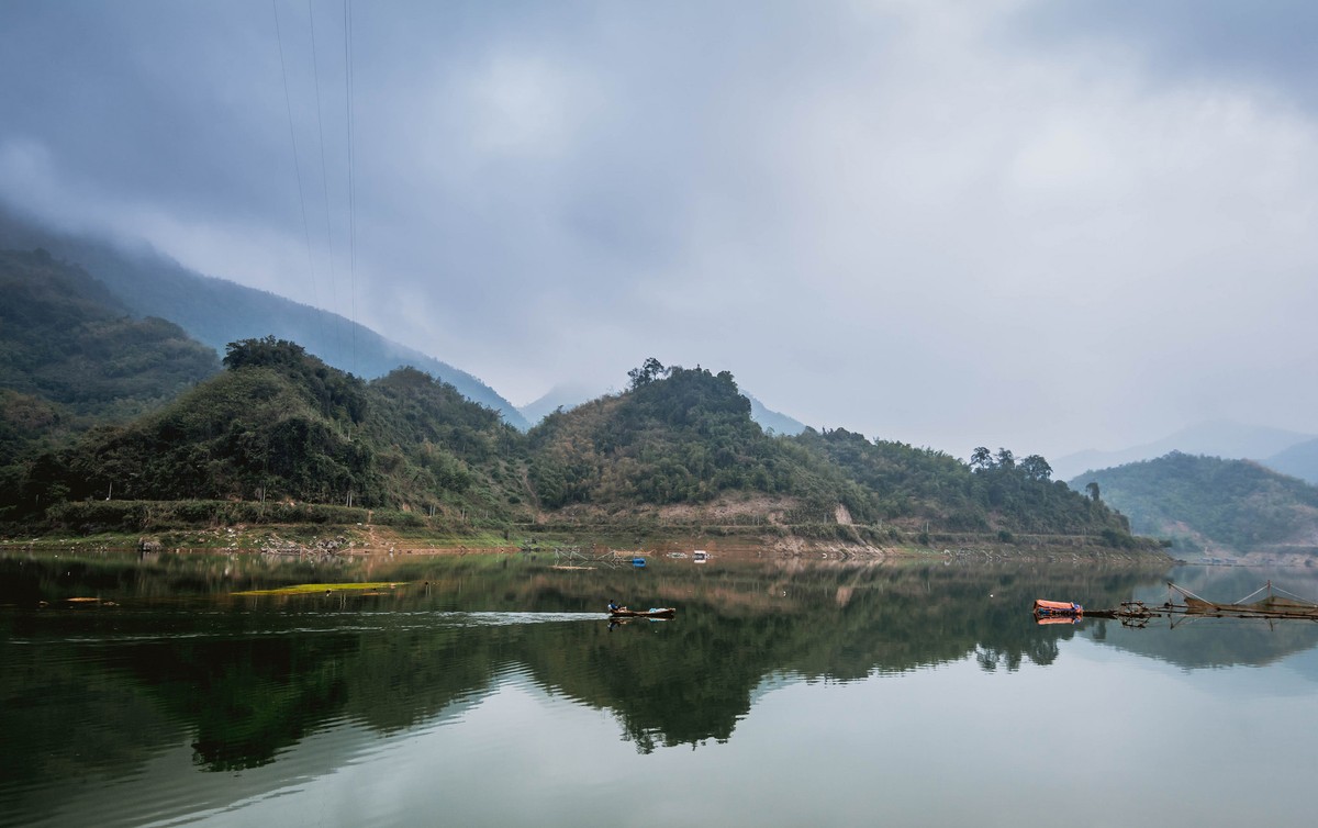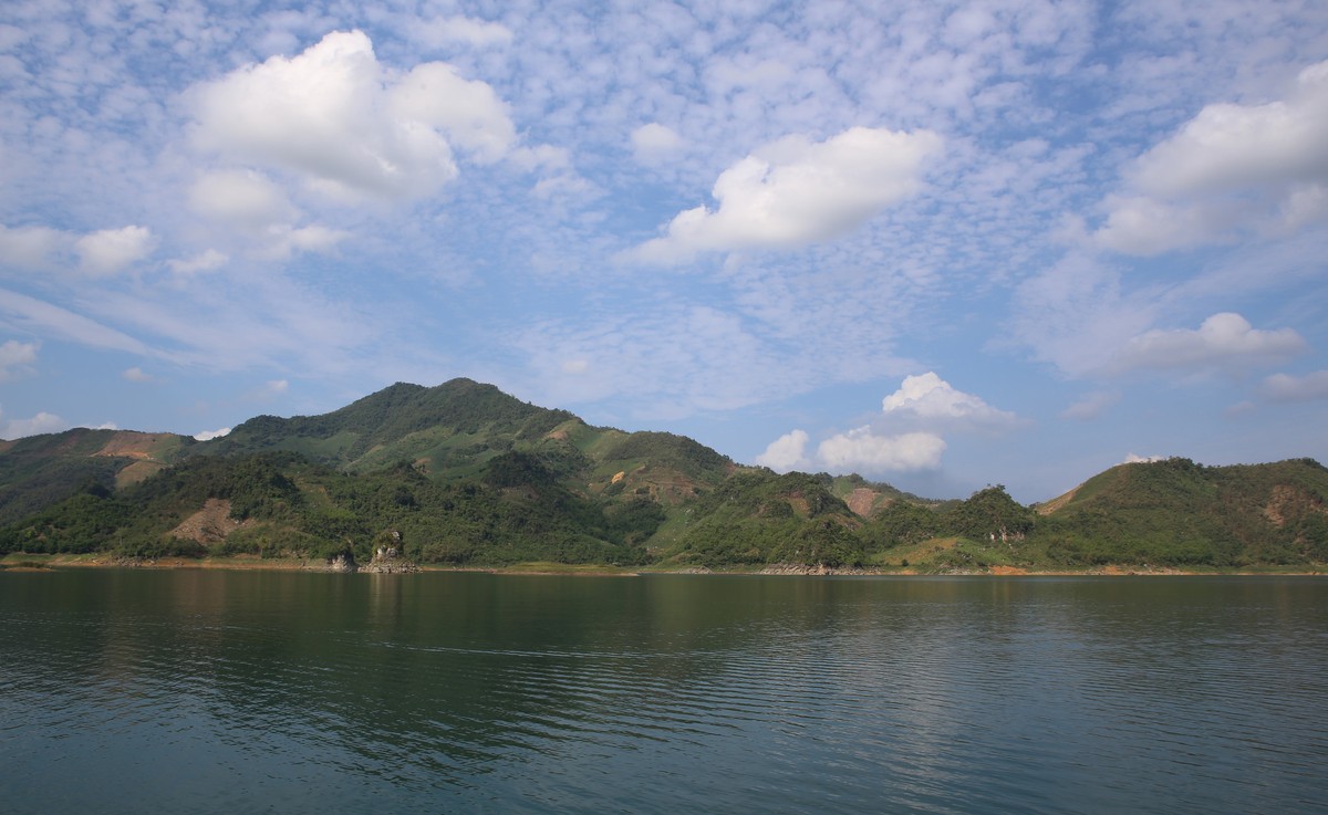 Dòng sông bây giờ mang một màu xanh đến kỳ lạ, bình lặng như thấm đẫm chất thơ. Thuyền đi chen giữa núi, giữa đồi, giữa những con nước lững lờ trôi. Đâu đó xa xa, một vài chiếc thuyền nhỏ len mình giữa sóng nước, trở thành điểm nhấn giữa màu xanh trời và sông núi hòa làm một. Nó như một nét chấm phá cho bức tranh hoàn mỹ về sự bình yên giữa núi đồi, giữa những bộn bề của cuộc sống hiện đại.