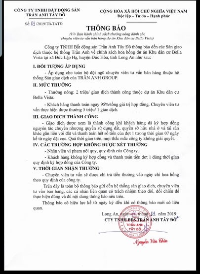 Cụ thể, trong văn bản số 03/2019/TB-TATĐ, Công ty TNHH Bất động sản Trần Anh Tây Đô thông báo đến các sàn giao dịch thuộc hệ thống Trần Anh về chính sách hoa hồng dự á Khu dân cư Bella Vista tại xã Đức Lập Hạ, huyện Đức Hòa, tỉnh Long An.