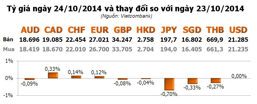 Với các ngoại tệ khác, đồng tiền phương Tây tăng, phương Đông giảm. Trong đó, giảm mạnh nhất là JPY với -0,70%; tiếp đến là SGD với -0,33%; THB với -0,27%... Tăng mạnh nhất là CAD với 0,33%; tiếp đến là CHF và EUR với lần lượt 0,14% và 0,12%.