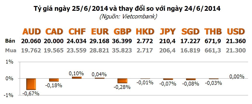 Các ngoại tệ khác hầu hết giảm, mạnh nhất là AUD với -0,67%; tiếp đến là GBP với -0,28%; CAD với -0,18%...