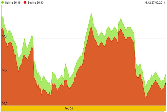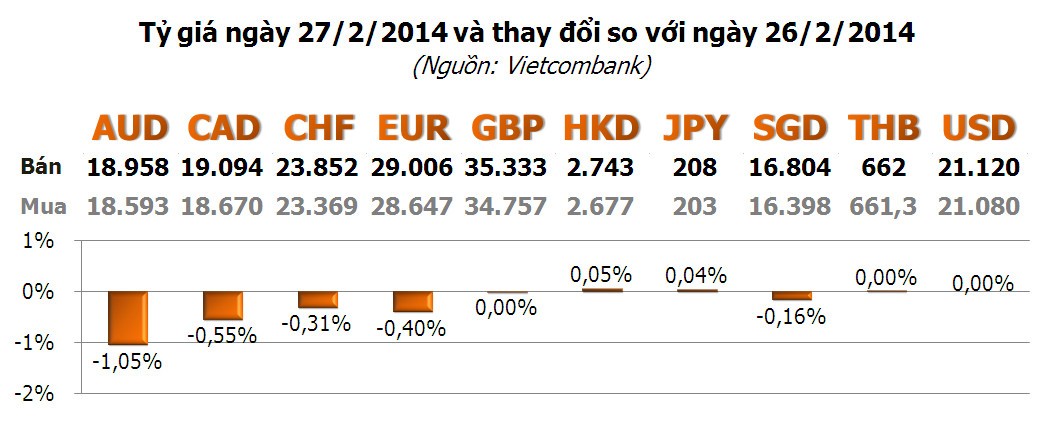 Các đồng tiền khác giảm giá so với VND do đồng USD mạnh lên trên thị trường quốc tế liên quan đến diễn biến địa chính trị ở Ukraine. Theo đó, cặp tỷ giá EUR/USD giảm mạnh trong ngày hôm qua từ mức 1,3740 còn 1,3652 vào lúc 4h30 chiều qua. Đồng EUR cũng giảm mạnh so với các ngoại tệ khác.