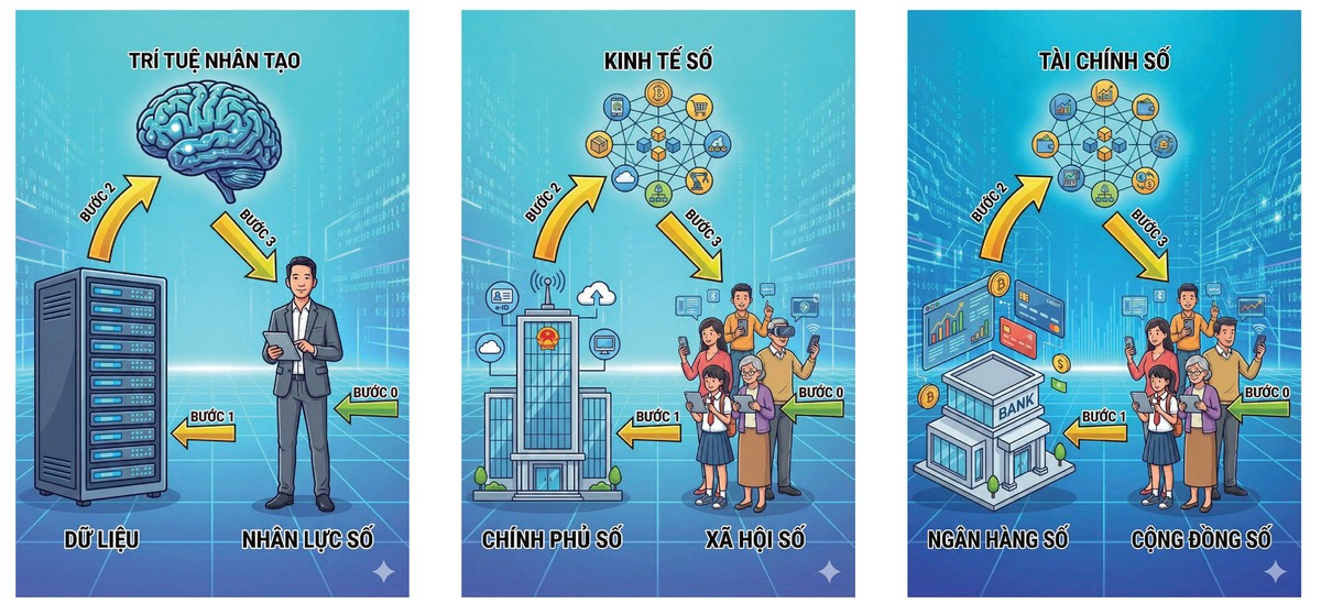 Chính phủ đang thúc đẩy chuyển đổi số dựa trên ba trụ cột: xã hội số, kinh tế số và chính phủ số. Việc xây dựng các cộng đồng học tập chính là kiến tạo xã hội số, hình thành các “bộ lạc số” gắn kết trên không gian mạng. Khi người dân ứng dụng kỹ năng AI để nâng cao năng suất, mở rộng thị trường, tạo giá trị kinh tế, họ đồng thời góp phần thúc đẩy kinh tế số và tạo ra dữ liệu phục vụ quản lý, ra quyết định hiệu quả - tức là góp phần xây dựng chính phủ số hay quản trị số. Đây chính là mô hình xăng - xe - tài xế được nâng lên tầm cao hơn: chính phủ số, kinh tế số và xã hội số.