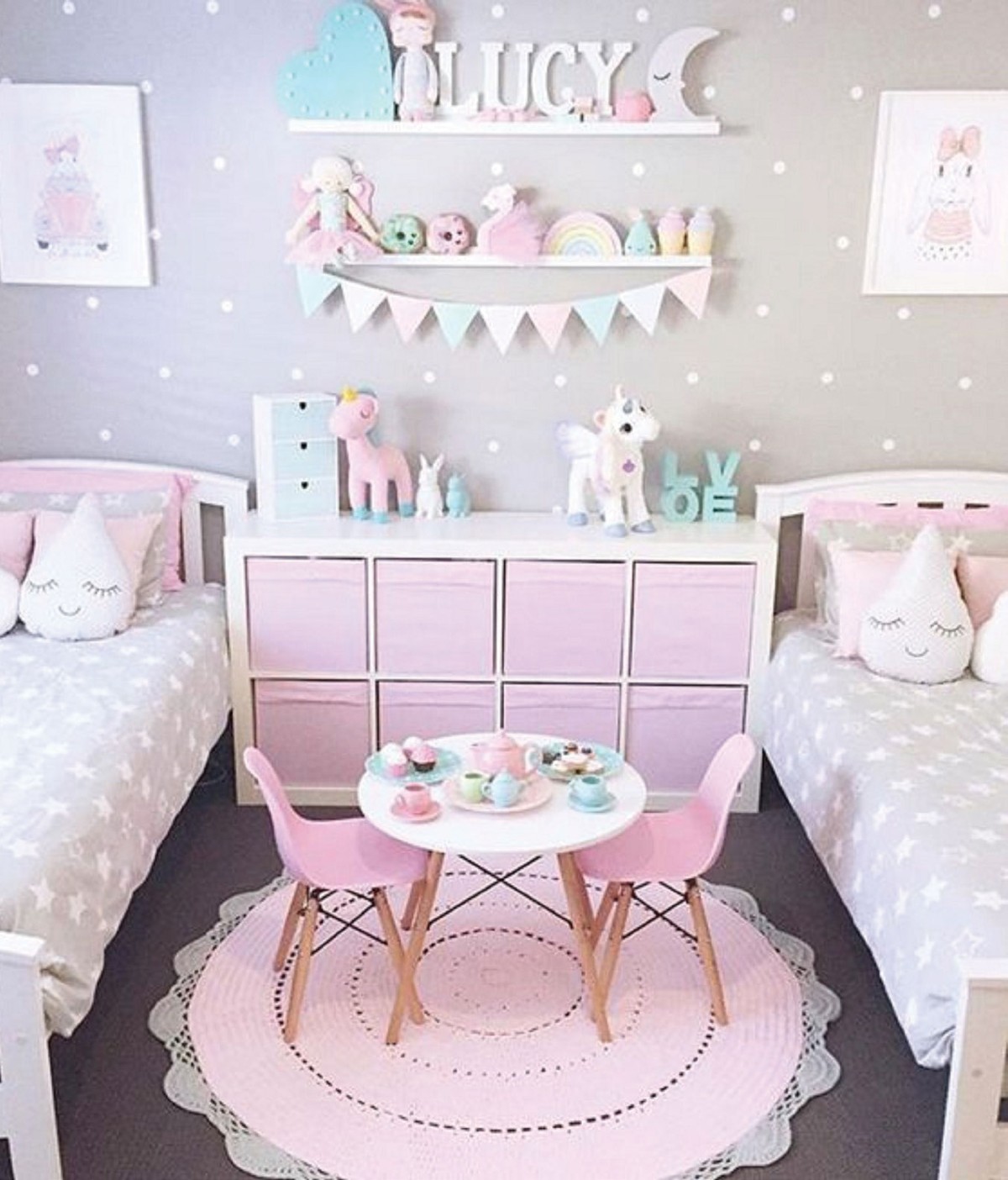 Đối với đồ vật và vật liệu trang trí, ngoài các bức tranh, giấy dán tường hoặc hình vẽ mộng mơ phù hợp với không gian cổ tích, thì trong phòng cũng không thể thiếu các chú gấu bông, thỏ bông xinh xắn. Chỉ cần một hình vẽ đơn giản cũng đem lại sự khác biệt cho mẫu phòng ngủ, cũng có thể trang trí căn phòng kẹo ngọt sẽ khiến các bé thỏa sức say sưa trong không gian của riêng mình. Ngoài ra, việc sử dụng các đồ chơi, búp bê dễ thương không chỉ làm cho bé thoải mái, mà còn tạo ra nhiều điều thú vị khác cho bé trước khi ngủ.