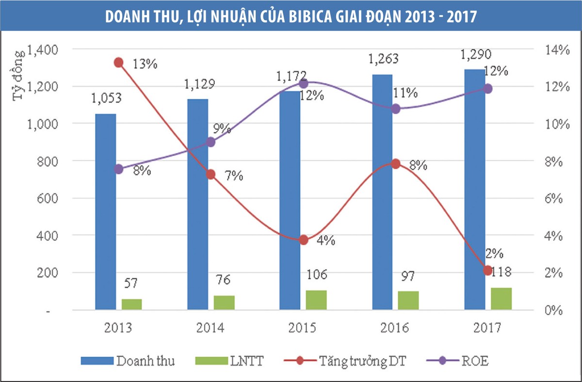Với kết quả lợi nhuận sau thuế năm 2017 đạt 97,3 tỷ đồng, tương đương thu nhập trên mỗi cổ phần (EPS) là 6.311 đồng, Bibica có thể xem là một doanh nghiệp có hiệu quả hoạt động tốt so với mặt bằng chung của thị trường. Thế nhưng, tỷ suất sinh lời trên vốn chủ sở hữu (ROE) và trên tổng tài sản (ROA) hầu như không tăng trưởng trong 3 năm qua, ROE xoay quanh mức 12%, trong khi ROA xoay quanh mức 8,5%.