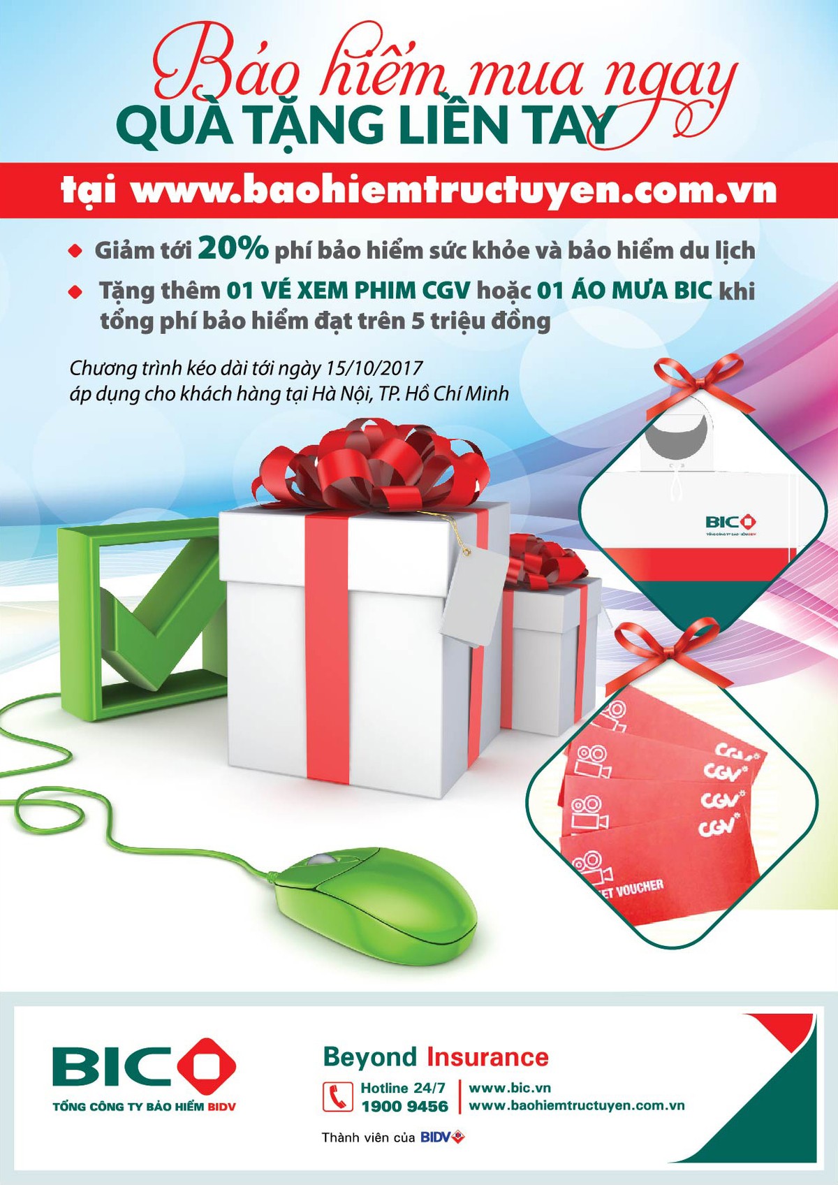 (ĐTCK) Nhằm tri ân khách hàng mua bảo hiểm qua kênh trực tuyến, từ ngày 15/7/2017 - 15/10/2017, Tổng Công ty Bảo hiểm BIDV (BIC) triển khai chương trình khuyến mại “Bảo hiểm mua ngay, quà tặng liền tay”. Đây cũng là chương trình ưu đãi lớn nhất từ đầu năm của BIC dành cho các khách hàng mua bảo hiểm tại website www.baohiemtructuyen.com.vn.