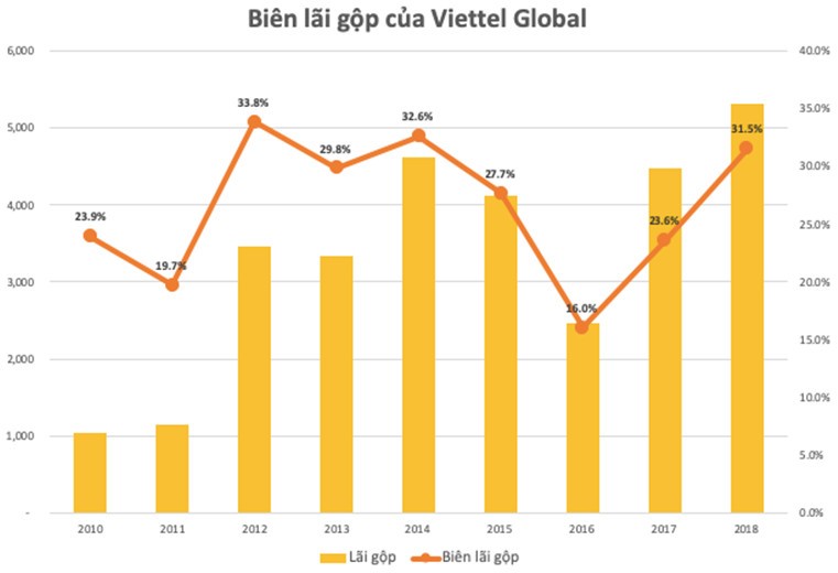 Tỷ trọng doanh thu dịch trên tổng doanh thu năm 2018 chiếm đến 92% - mức cao nhất kể từ năm 2012 khi Viettel Global bắt đầu mở rộng sang khu vực châu Phi. Nhờ tập trung vào dịch vụ có tỷ suất lợi nhuận cao nên dù tổng doanh thu có giảm so với năm ngoái nhưng lợi nhuận gộp vẫn tiếp tục lập kỷ lục mới, đạt hơn 5.300 tỷ đồng - tăng 19% so với năm trước.