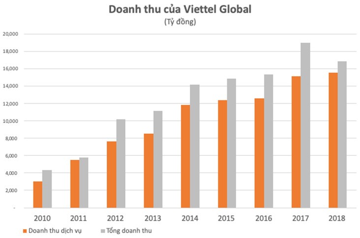 Lũy kế cả năm 2018, Viettel Global đạt 16.867 tỷ đồng doanh thu thuần, giảm hơn 2.100 so với năm trước chủ yếu là do doanh thu kinh doanh thiết bị giảm từ gần 3.900 tỷ xuống 1.300 tỷ đồng.