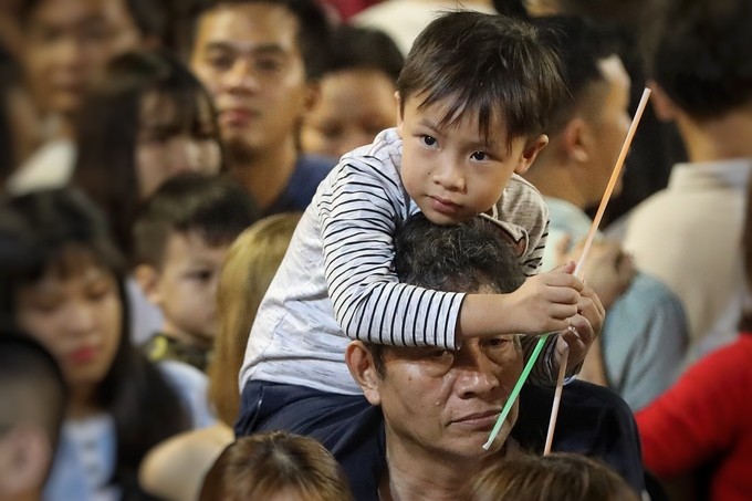 Một bé trai mệt mỏi, được người thân kiệu trên vai.