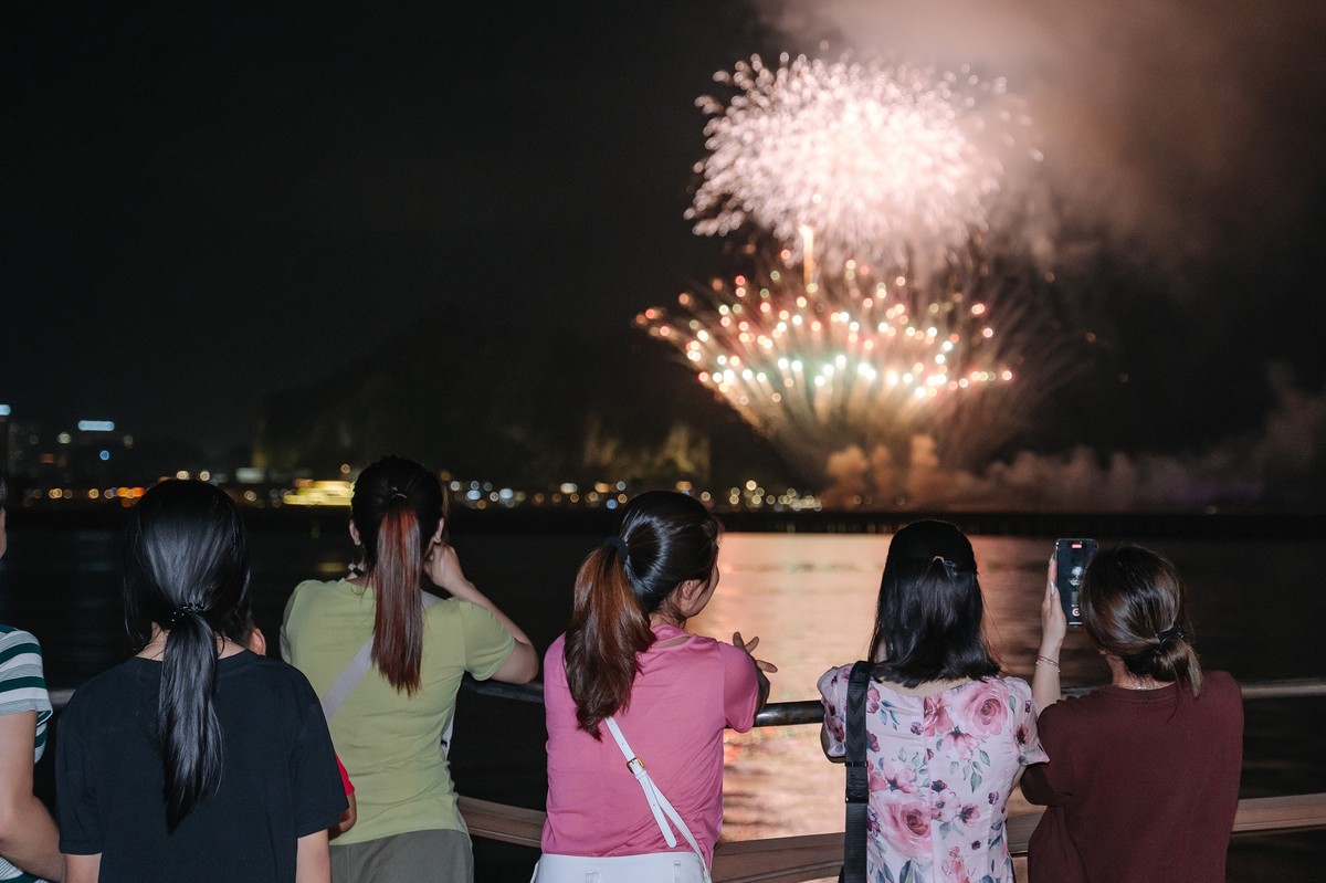 Nhiều du khách lựa chọn trải nghiệm cao cấp hơn: vừa ăn tối, vừa ngắm pháo hoa từ du thuyền trên vịnh. Những thuyền ánh sáng rực rỡ neo dọc khu vực cảng tàu khách quốc tế Hạ Long là nơi du khách có thể thưởng thức tiệc tối, những ly champagne và chiêm ngưỡng pháo hoa bung nở rực rỡ ngay trước mắt. Đây cũng là lý do khiến nhiều người chọn ở lại Hạ Long thêm buổi tối hoặc qua đêm.