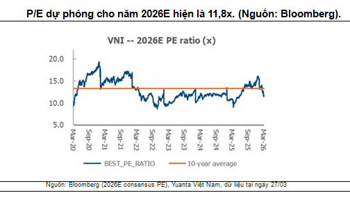 Chỉ số VN-Index đang trong quá trình tạo đáy sau khi điều chỉnh khoảng 16% so với mức đỉnh hồi tháng 2. Theo đó, định giá cũng về mức hấp dẫn hơn khi VN-Index đang giao dịch tại mức P/E dự phóng 2026E là ~11.8x, thấp hơn mức bình quân 10 năm là ~13.5x.