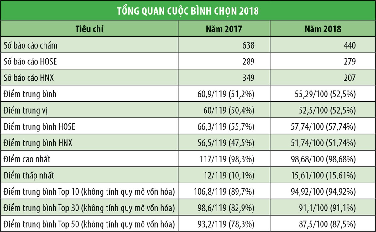 Nhìn chung, chất lượng báo cáo thường niên của doanh nghiệp trên cả 2 sở giao dịch chứng khoán có sự cải thiện, thể hiện qua điểm trung bình và điểm trung vị của toàn bộ các báo cáo năm 2018 cao hơn so với năm 2017 (điểm trung bình của năm 2018 là 52,5% so với 51,2% của 2017, điểm trung vị của năm 2018 là 52,5% so với 50,4% của năm 2017). Trên hầu hết các tiêu chí đánh giá, kết quả năm 2018 cũng đều cao hơn năm 2017.