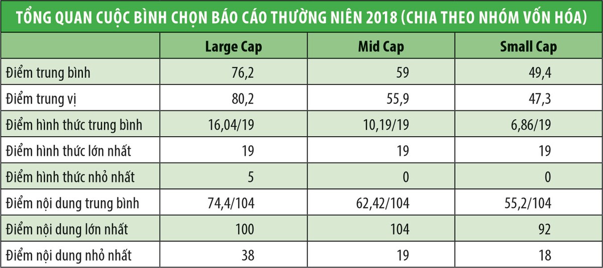 Điểm sáng cần khích lệ là điểm nội dung cao nhất ở nhóm small cap đạt 92/104 cũng là mức điểm cao, cho thấy một số doanh nghiệp nhỏ đã có sự đầu tư thích hợp cho việc lập báo cáo thường niên và thông tin ra thị trường.