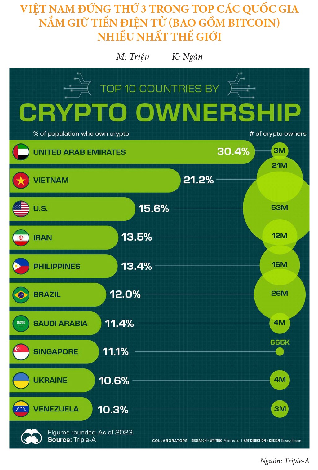 Dữ liệu từ cổng thanh toán tiền điện tử Triple-A cho biết, trong 10 quốc gia có tỷ lệ phần trăm dân số sở hữu tiền điện tử (bao gồm Bitcoin) cao nhất thế giới, Việt Nam xếp thứ hai với tỷ lệ 21,2%, chỉ sau Các Tiểu Vương quốc Ả-rập Thống nhất.