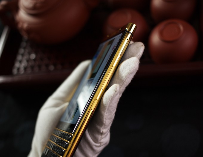 Đỉnh máy với tấm nhựa ABS sơn giả kim loại cũng đã được thay thế bằng vàng hợp kim Bạc-Platinum 950 chắc chắn hơn, bên ngoài phủ vàng 24K.