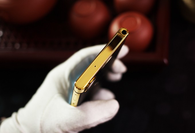 Bên cạnh khung, có tất cả 9 chi tiết được mạ vàng, bao gồm khay sim, phím tăng giảm âm lượng và phím nguồn.