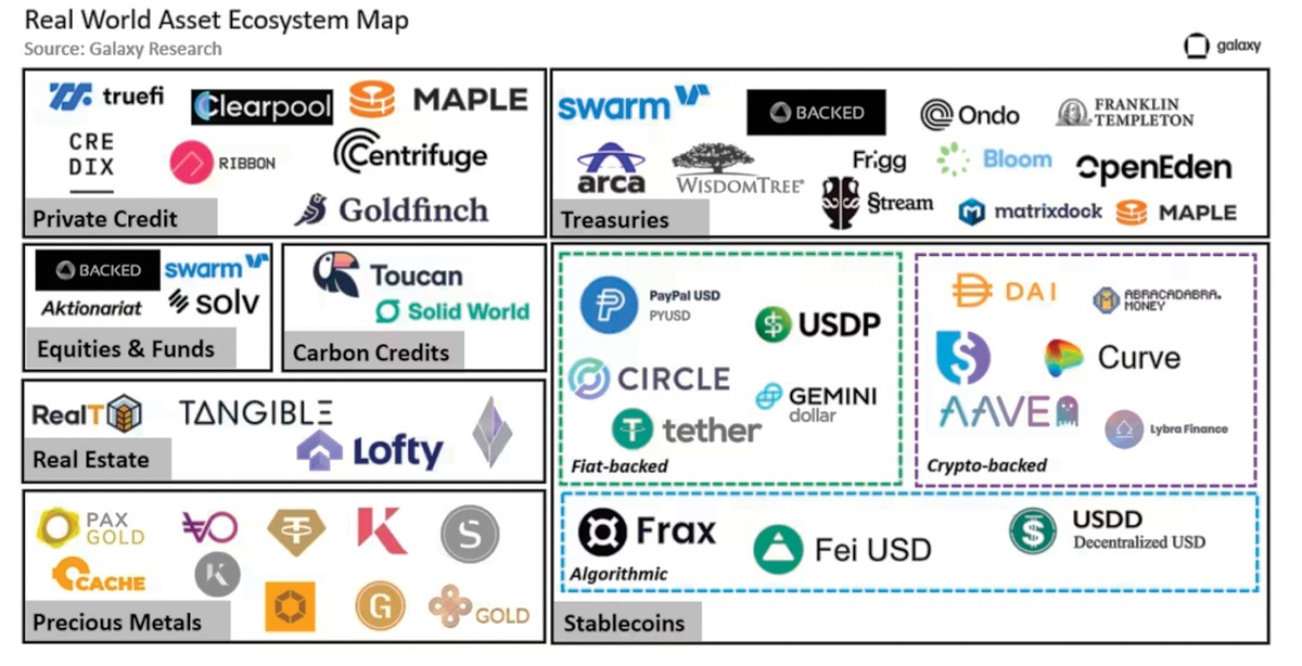 Bản đồ hệ sinh thái các tài sản mã hóa thế giới thực của Galaxy Research cho thấy bức tranh sơ bộ của các tổ chức phát hành RWA (xem bản đồ). Trong đó, các tổ chức phát hành RWA đáng chú ý là Centrifuge (với 238 triệu USD trong RWA được phát hành) - công ty phát hành các khoản vay tín dụng tư nhân trên chuỗi lớn nhất; Franklin Templeton (với 310 triệu USD trong RWA được phát hành) - một tổ chức tài chính truyền thống phát hành trái phiếu kho bạc mã hóa.