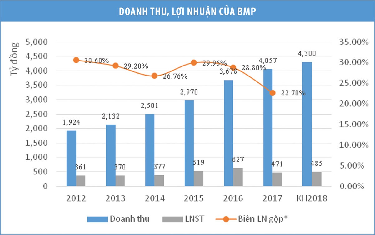 Song song với giá vốn, chi phí tài chính và chi phí quản lý doanh nghiệp của BMP cũng tăng lần lượt 135% và 13,96% so với năm 2016, trong khi doanh thu hoạt động tài chính giảm mạnh 50%. Kết quả, lợi nhuận trước thuế cả năm thu về chỉ 582,9 tỷ đồng, giảm 25% so với cùng kỳ năm trước đó, đánh dấu năm sụt giảm lợi nhuận sau thuế đầu tiên kể từ năm 2008.