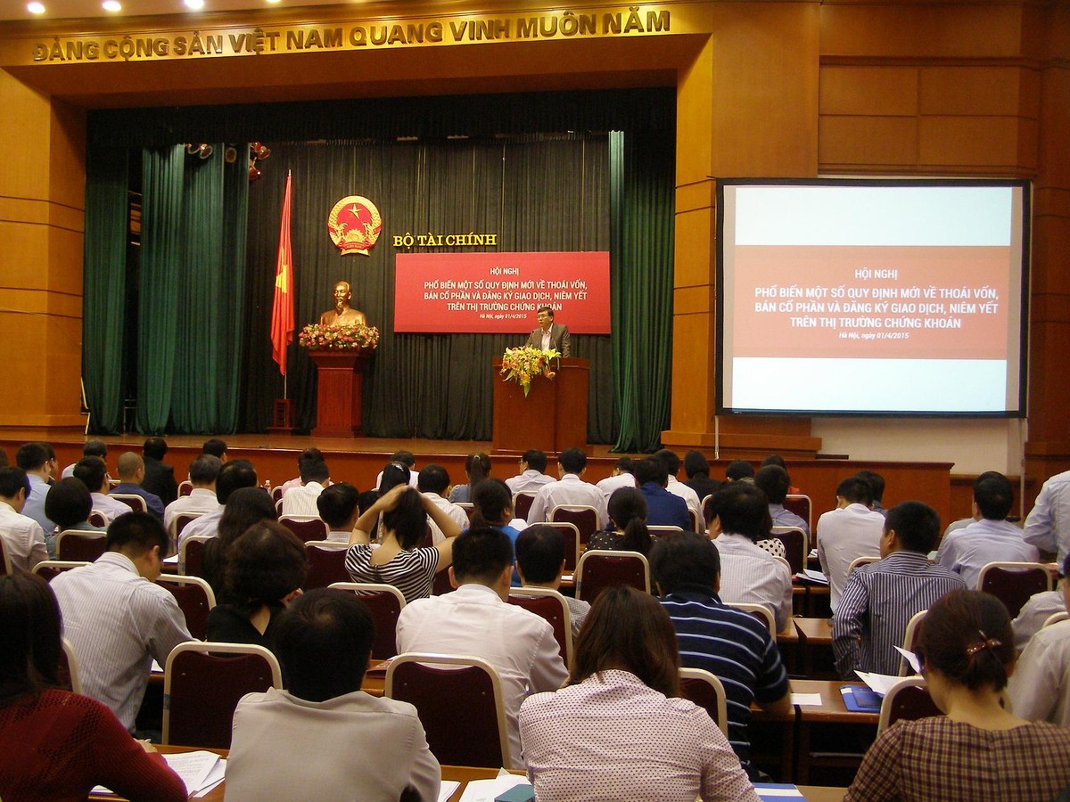 Hội nghị phổ biến một số quy định mới về thoái vốn, bán cổ phần, đăng ký giao dịch và niêm yết trên TTCK, do Bộ Tài chính tổ chức sáng nay (1/4)