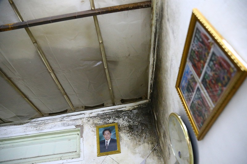Phòng ngủ của gia đình ông Ngọc chịu cảnh ẩm thấp, vữa rơi từng mảng chỉ có thể lấy vải hứng