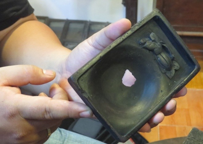 Chiếc nghiên mực có từ đời Minh được làm bằng đá Đoan Khê, đến nay chỉ cần hà hơi là ra mực.