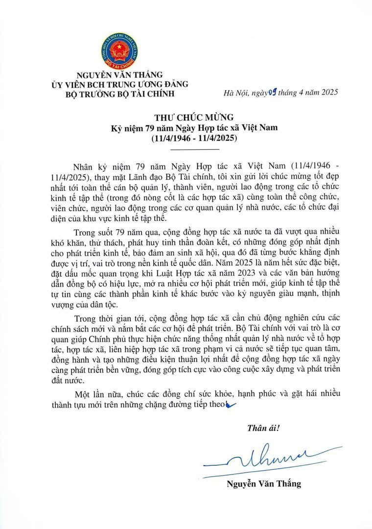 Nhân kỷ niệm 79 năm Ngày Hợp tác xã Việt Nam (11/4/1946 - 11/4/2025), thay mặt Lãnh đạo Bộ Tài chính, đồng chí Nguyễn Văn Thắng, Ủy viên Ban Chấp hành Trung ương Đảng, Bí thư Ban Cán sự Đảng, Bộ trưởng Bộ Tài chính gửi Thư chúc mừng tới các cán bộ quản lý, thành viên, người lao động trong các tổ chức kinh tế tập thể (trong đó nòng cốt là các hợp tác xã) cùng toàn thể công chức, viên chức, người lao động trong các cơ quan quản lý nhà nước, các tổ chức đại diện của khu vực kinh tế tập thể. Báo Tài chính Đầu tư xin trân trọng giới thiệu toàn văn Thư chúc mừng.