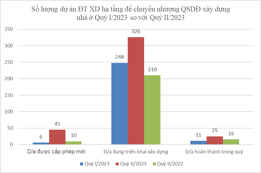 Theo Bộ Xây dựng, với dự án phát triển nhà ở thương mại, quý II/2023 cả nước hoàn thành 7 dự án với 2.424 căn (852 căn hộ; 1.572 căn nhà ở riêng lẻ), bằng khoảng 50% so với quý I/2023 và bằng khoảng 29,17% so với quý II/2022.