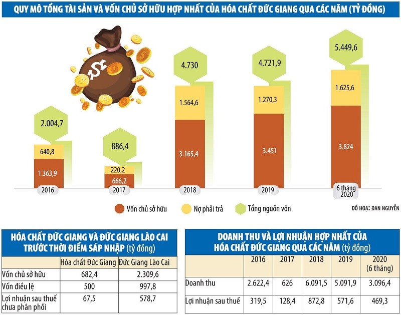 Xét về tình hình tài chính, công ty mẹ Hóa chất Đức Giang trước khi nhận sáp nhập Hóa chất Đức Giang Lào Cai có giá trị sổ sách là 13.648 đồng/cổ phiếu, trong khi Hóa chất Đức Giang Lào Cai có giá trị sổ sách là 23.146,9 đồng/cổ phiếu. Trong đó, Hóa chất Đức Giang Lào Cai có khoản lợi nhuận chưa phân phối tích lũy đến thời điểm trước khi sáp nhập là 578,7 tỷ đồng.