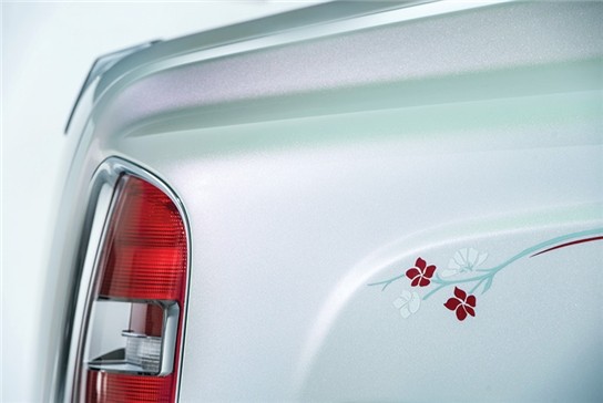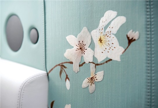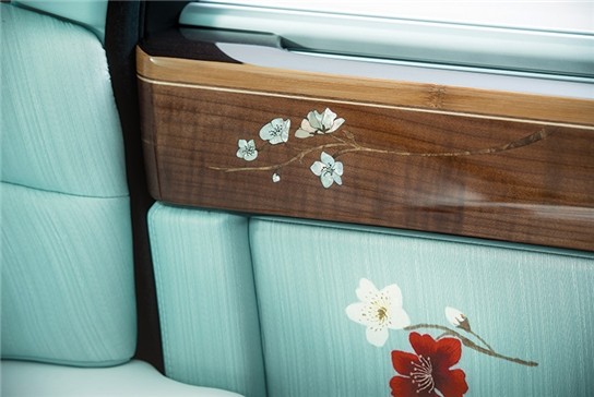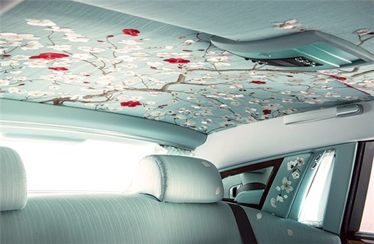 Từ ghế ngồi tới trần xe được bọc bằng vải tơ màu xanh pastel có nguồn gốc từ Tô Châu - một trong những thủ đô thêu lụa của Trung Quốc và được dệt ở một trong những nhà máy lâu đời nhất của Vương quốc Anh. Những họa tiết hoa tinh tế của hoàng gia Nhật Bản được thêu tay trong suốt. Chiếc xe mang vẻ đẹp sang trọng của một căn phòng trong cung điện, hay những mẫu quần áo thời trang cao cấp.