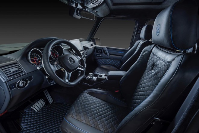 Nội thất của siêu SUV mới của Brabus được bọc da toàn bộ với hai màu đen và xanh, trang trí chỉ khâu màu xanh tương phản.