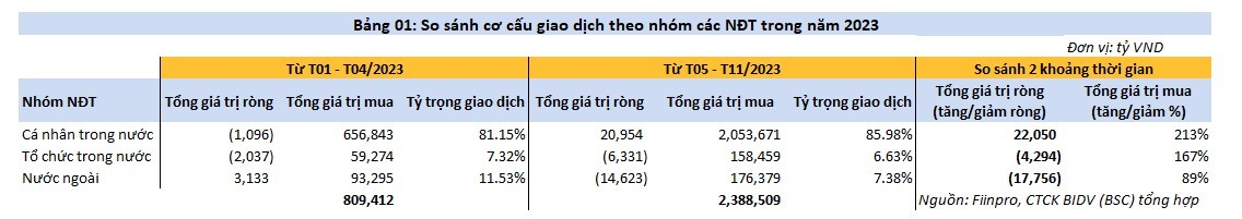 Theo BSC, nhà đầu tư cá nhân là động lực chính cho giai đoạn thị trường tăng điểm kéo dài trong suốt 4 tháng, từ cuối tháng 4 đến hết tháng 8/2023 sau khi khối ngoại bắt đầu động thái bán ròng kể từ quý II/2023.