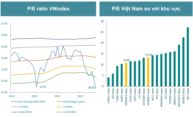 Trong khi đó, P/E VN-Index kết thúc tháng 10 ở mức 10,9 lần, giảm 9,9% so với tháng 9, và cũng là mức thấp tương đương giai đoạn tháng 3/2020 (thị trường giảm mạnh vì Covid). P/E VN-Index do vậy giảm thêm 2 bậc về thứ 5 của các châu Á, trong khi P/E HNX-Index ở mức 13,3 lần – đứng thứ 10 khu vực.