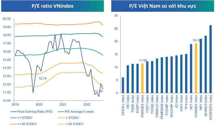 P/E VN-Index dự báo vận động trong vùng 11,5 - 12 lần trong kịch bản tích cực khi VN-Index quay trở lại vùng tích lũy 1.050 - 1.100 điểm.