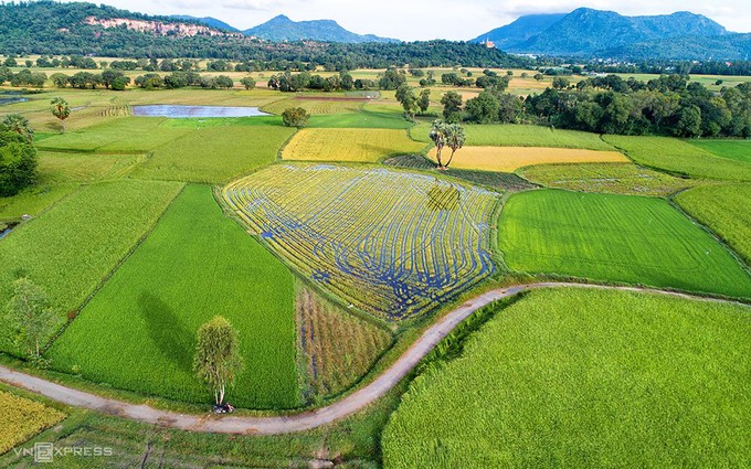 Con đường đất uốn lượn quanh các thửa ruộng tạo nên nét đẹp riêng trên đồng lúa ở An Giang. Nghệ sĩ nhiếp ảnh Huỳnh Phúc Hậu (An Giang), tác giả bộ ảnh, cho biết: “Tà Pạ đang vào mùa đẹp nhất trong năm, khi những cánh đồng lúa đang chín vàng. Sáng sớm chạy xe thong dong trên con đường nhỏ, xuyên qua những thửa ruộng để chụp ảnh hoặc bay flycam, bạn sẽ ghi lại được khung cảnh đẹp như trong Bức họa đồng quê”.