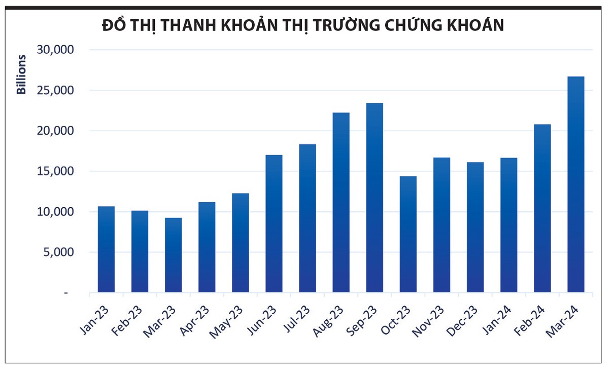 Nhìn trong bức tranh chung, nhóm công ty chứng khoán được dự phóng có kết quả kinh doanh quý I tăng trưởng tốt. Thanh khoản trên thị trường chứng khoán đã tăng dần qua từng tháng (xem đồ thị), tương đồng là giá trị margin tăng mạnh, đem lại nguồn thu từ dịch vụ tài chính tăng cao. Quan trọng hơn, thị giá nhiều cổ phiếu tăng mạnh so với đầu năm nay khiến cho lãi từ đánh giá các tài sản tài chính của công ty chứng khoán vọt lên.