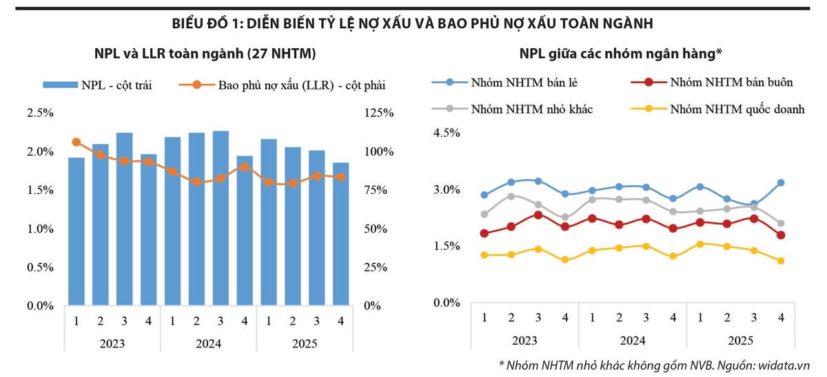 Trong năm 2025, khoảng hai phần ba số ngân hàng ghi nhận cải thiện cả tỷ lệ nợ xấu và mức bao phủ nợ xấu, phản ánh xu hướng tích cực trong quản trị chất lượng tài sản của toàn ngành. Tuy nhiên, số còn lại vẫn cho thấy những điểm nghẽn nhất định, cho thấy quá trình ổn định chất lượng tín dụng chưa diễn ra đồng đều giữa các ngân hàng.