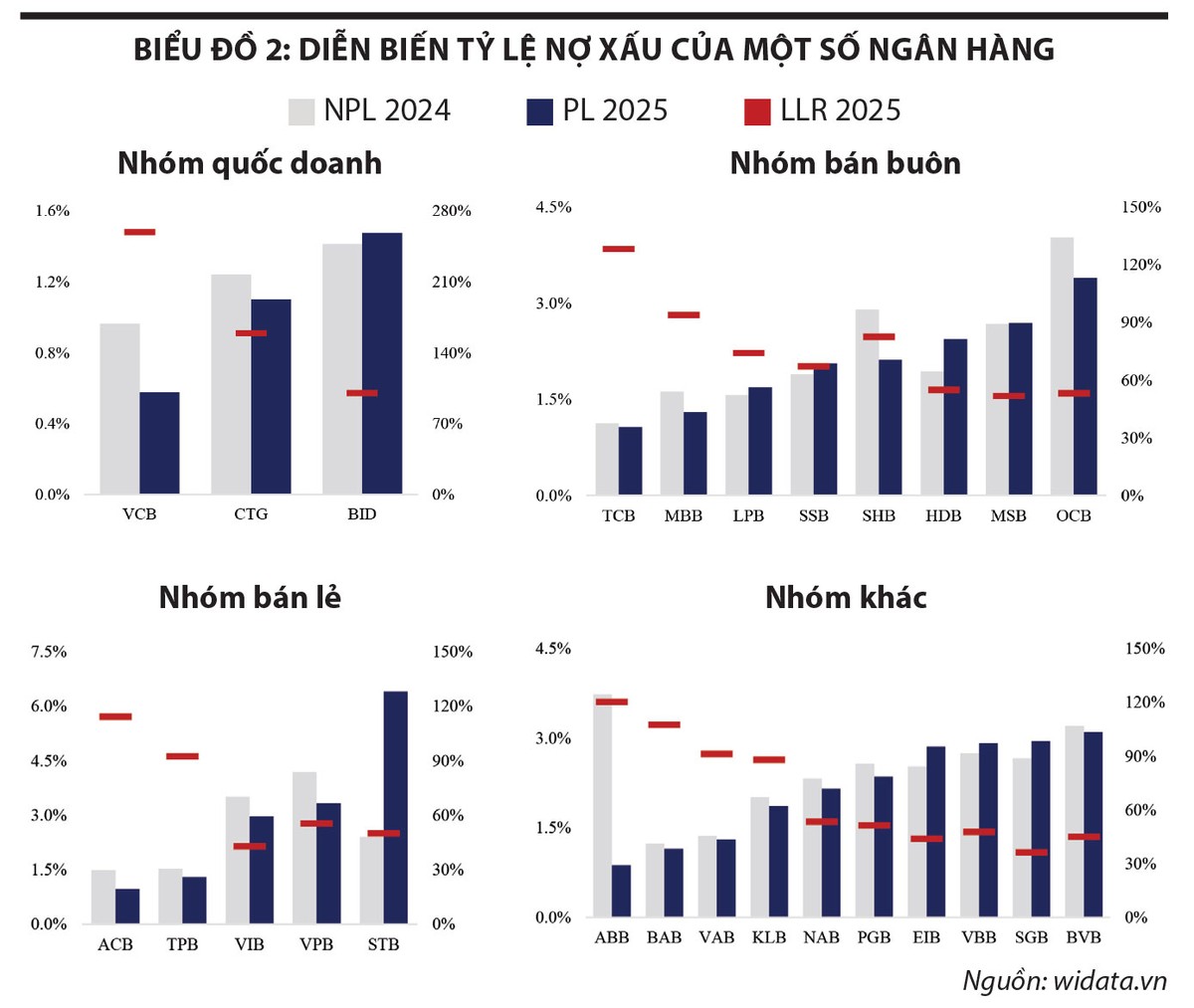 Diễn biến nợ xấu năm 2025 cho thấy bức tranh phân hóa rõ rệt giữa các nhóm ngân hàng. Một số ngân hàng chủ động tái cơ cấu và tăng trích lập dự phòng, qua đó giúp chất lượng tài sản được củng cố vững chắc. Tuy nhiên, vẫn còn không ít trường hợp đối mặt với áp lực nợ xấu gia tăng, đòi hỏi các chiến lược xử lý linh hoạt để bảo đảm sự ổn định và phát triển bền vững trong giai đoạn tới.