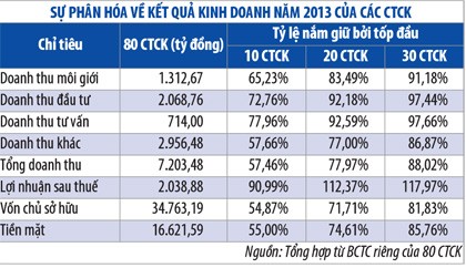 Vốn liếng tập trung vào một số ít công ty. Tổng vốn chủ sở hữu của 80 CTCK đến cuối năm 2013 là 34.763 tỷ đồng, tăng nhẹ 2,38% so với cuối năm 2012. 20 CTCK thuộc tốp đầu chiếm đến 71,71% tổng số vốn này.