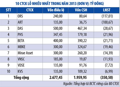 Năm qua, 55 CTCK có lãi với tổng mức lãi ròng hơn 2.444 tỷ đồng, tăng 43,7% so với năm 2012, trong khi 25 CTCK còn lại lỗ hơn 405 tỷ đồng, tức lỗ gấp hơn 2,2 lần năm 2012. Đa số CTCK lỗ trong năm 2013 đã lỗ từ trước đó.