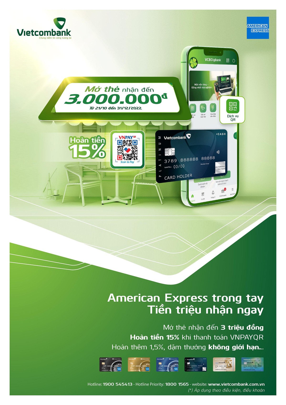 Ngoài ra, Vietcombank còn có chương trình ưu đãi chi tiêu thẻ American Express. Đối tượng là các khách hàng sử dụng thẻ Amex để thanh toán hàng hóa dịch vụ qua hình thức thanh toán QR trên Ứng dụng VCB Digibank tại đơn vị chấp nhận thanh toán của VNPAY sẽ được hoàn tiền 15% trên tổng doanh số thanh toán hợp lệ. Số tiền hoàn tối đa cho 01 KH trong cả chương trình là 1.000.000 VND. Số tiền giao dịch tối thiểu 01 KH trong cả chương trình là 1.000.000 VND. Áp dụng cho các khách hàng đủ điều kiện đầu tiên có doanh số chi tiêu hợp lệ. Chương trình không áp dụng cho thẻ công ty/thẻ công ty ủy quyền cho cá nhân sử dụng.